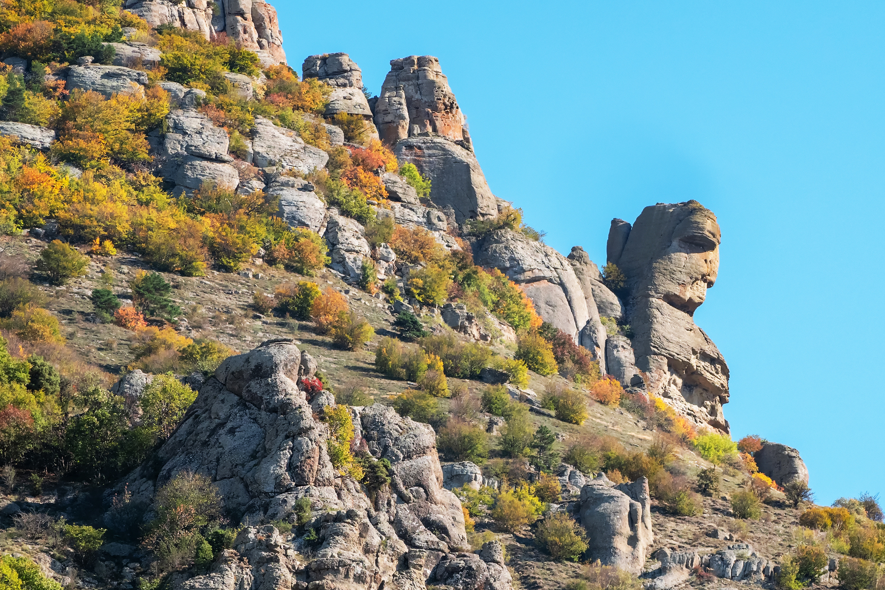 Есть на склонах крымской вершины Демерджи место под названием Долина привидений. Но обитают тут не Каспер и компания, а скалы-изваяния, похожие на призраков людей, животных и птиц. Причем, на протяжении дня, когда меняется освещение в долине, одна и та же природная скульптура принимает разные виды. А самый знаменитый здешний камень еще и вызывает эффект дежавю. Но тут никакого нарушения моментального реагирования мозга: ведь вы действительно уже его видели — в фильме «Кавказская пленница», когда на нем пела Наталья Варлей.