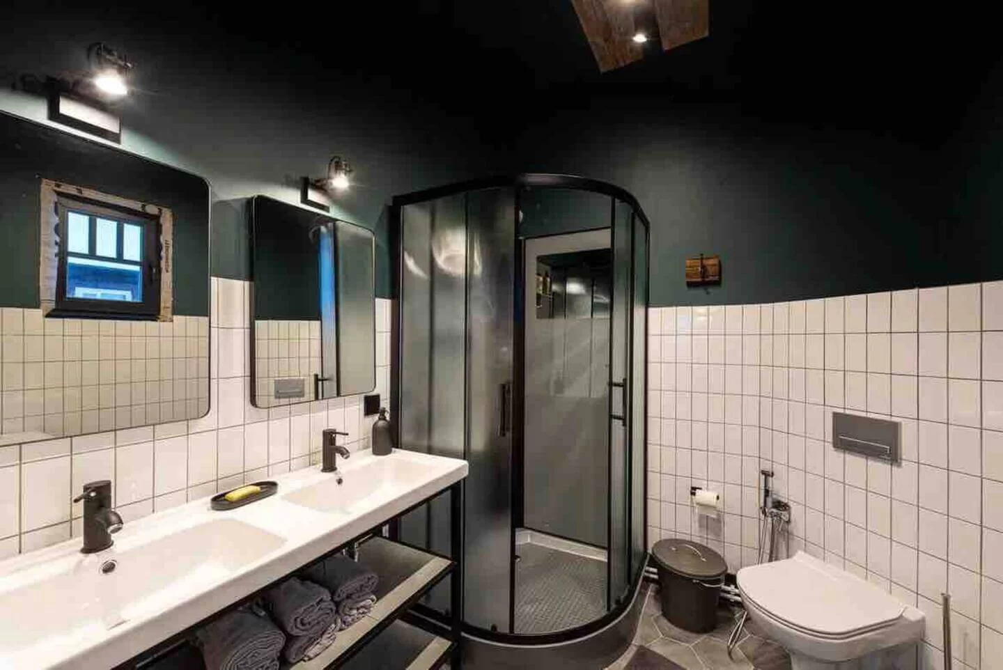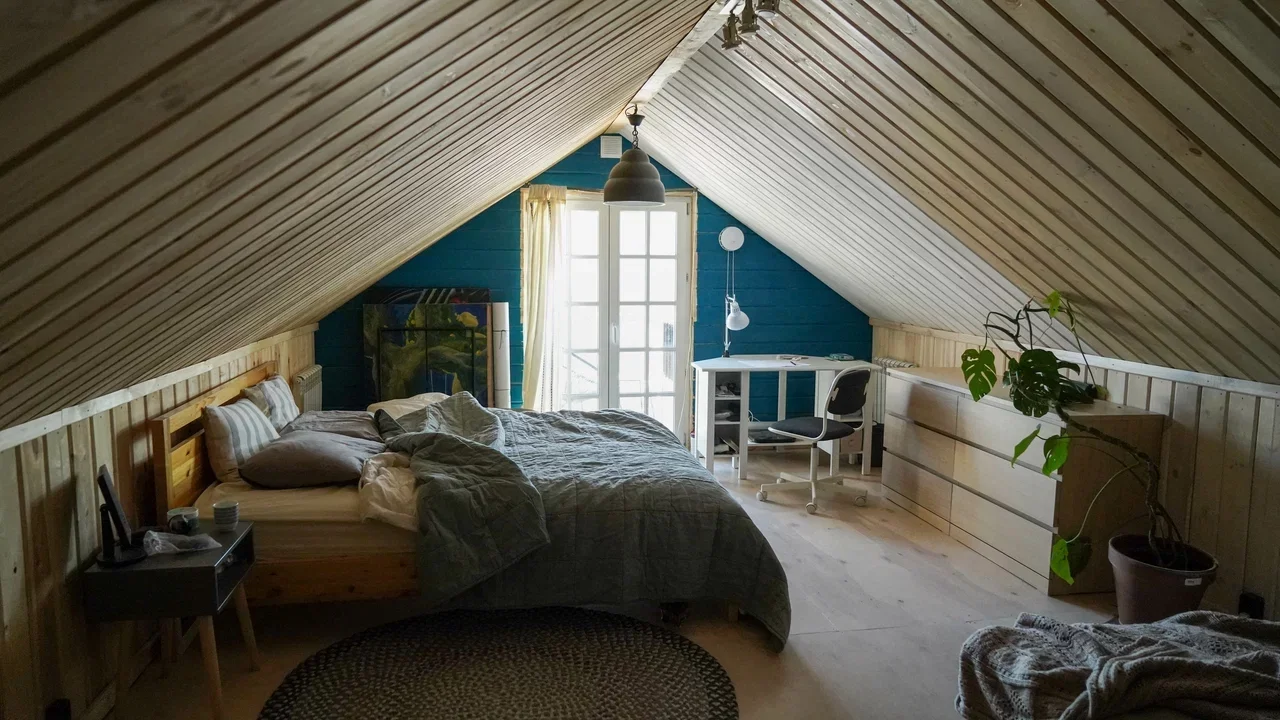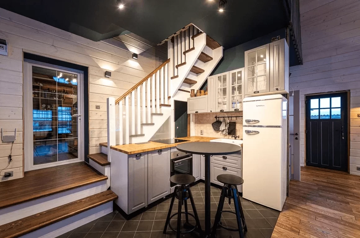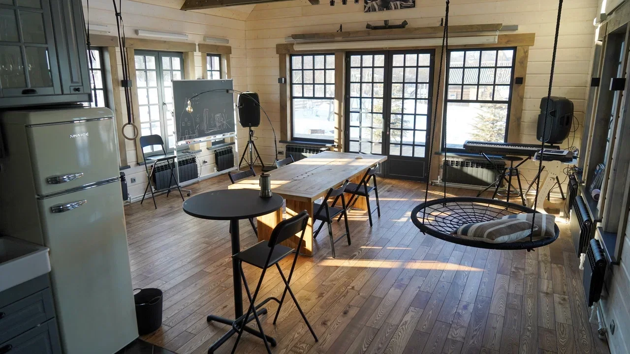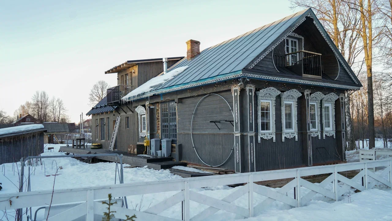 Смелая концепция постройки впечатлит даже завсегдатаев арт-ярмарок. Дом дерзко «сложили» из двух совершенно разных частей. Одна половина — русская изба с наличниками, резьбой, печью и сельской утварью. Другая — современная, оформленная со свойственным скандинавскому стилю минимализмом.