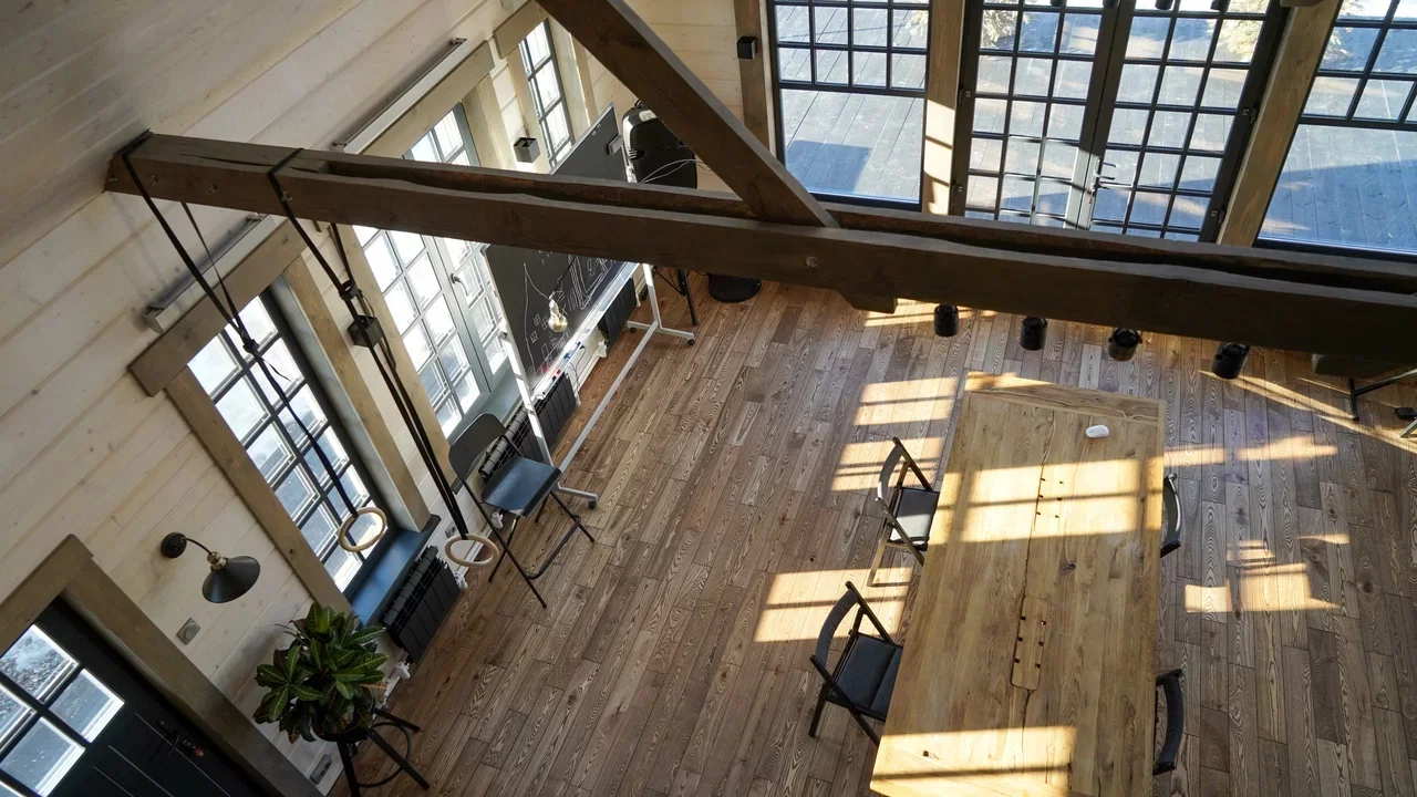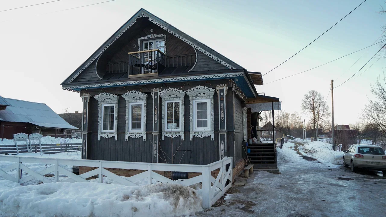 Первый этаж дома занимают гостиная с большим столом и кухня. Второй — две спальни с балконами и видом на Палех.